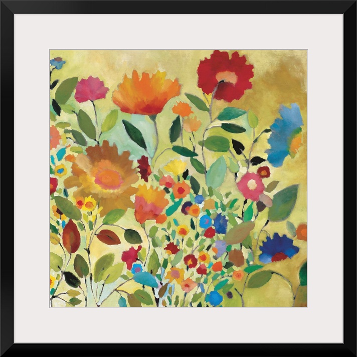 <p>A series of flowers and leaves in warm colors and a soft style against a pale yellow background.</p>