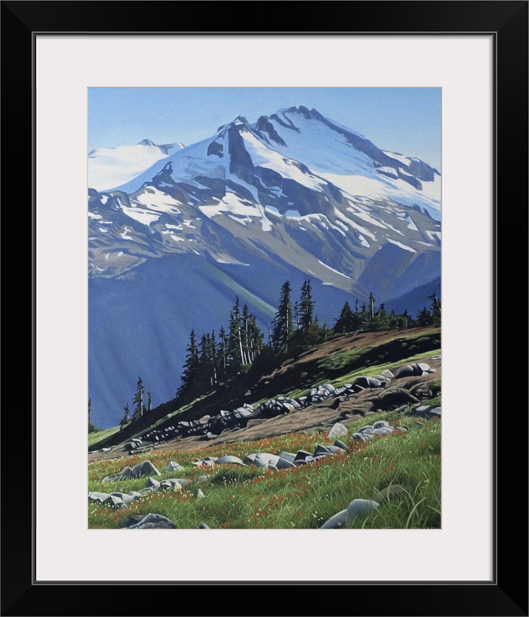<p>Painting of a snow topped mountain peak and a wilderness landscape in green on the foreground.</p>