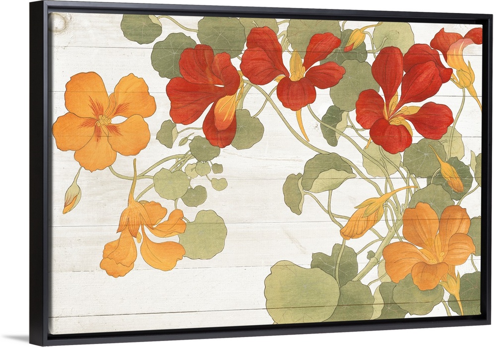 <p>Large contemporary painting of orange and red flowers with muted green leaves on a white wood panel background.</p>