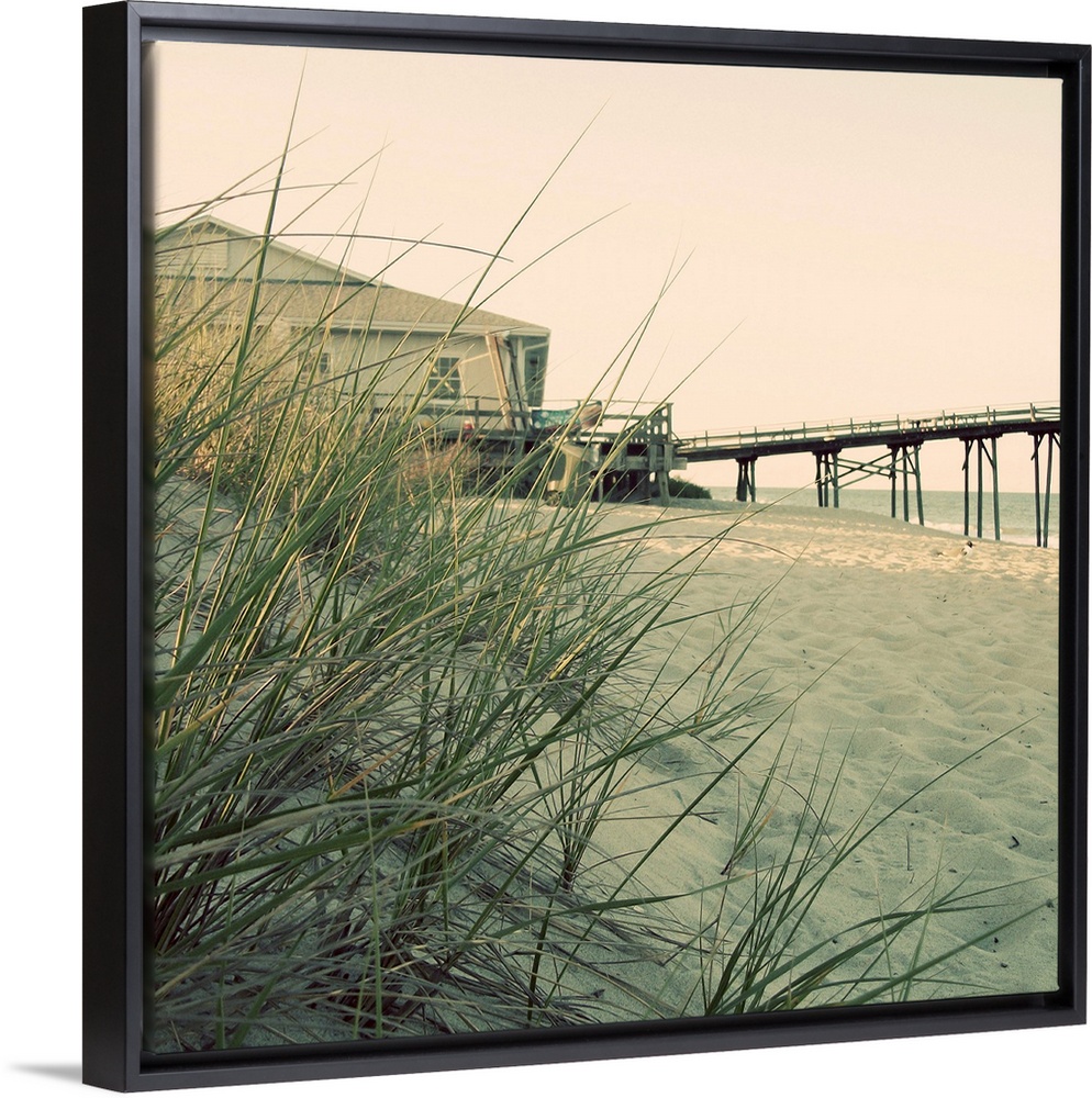 <p>Big square wall picture of grasses on a dune overlooking the beach, in the background is a building with a small pier leading out into the water.</p>