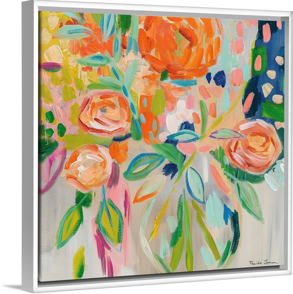 <p>Abstract square painting of a bouquet of flowers in bold shades of orange.</p>