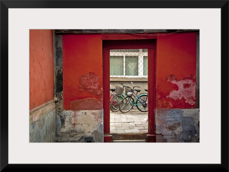 <p>Big, horizontal photograph of a clear glass doorway surrounded by red and grey cement walls. Through the door sits several bikes, in Beijing, China.</p>