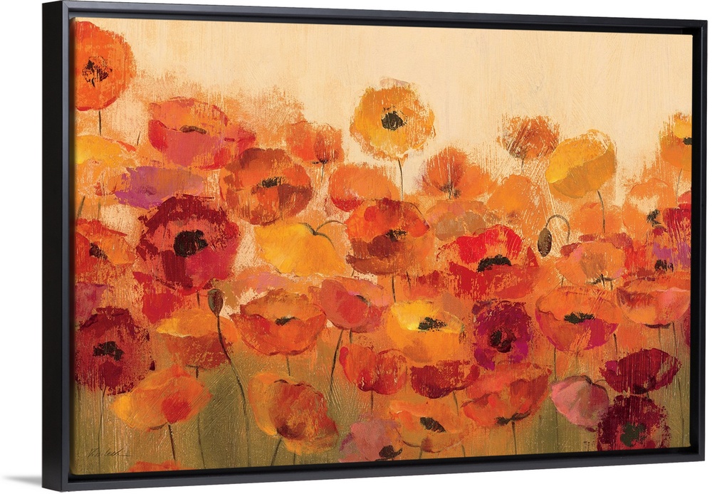 <p>Large painting of poppy flowers in bloom. The poppies are depicted in vibrant, warm tones.</p>