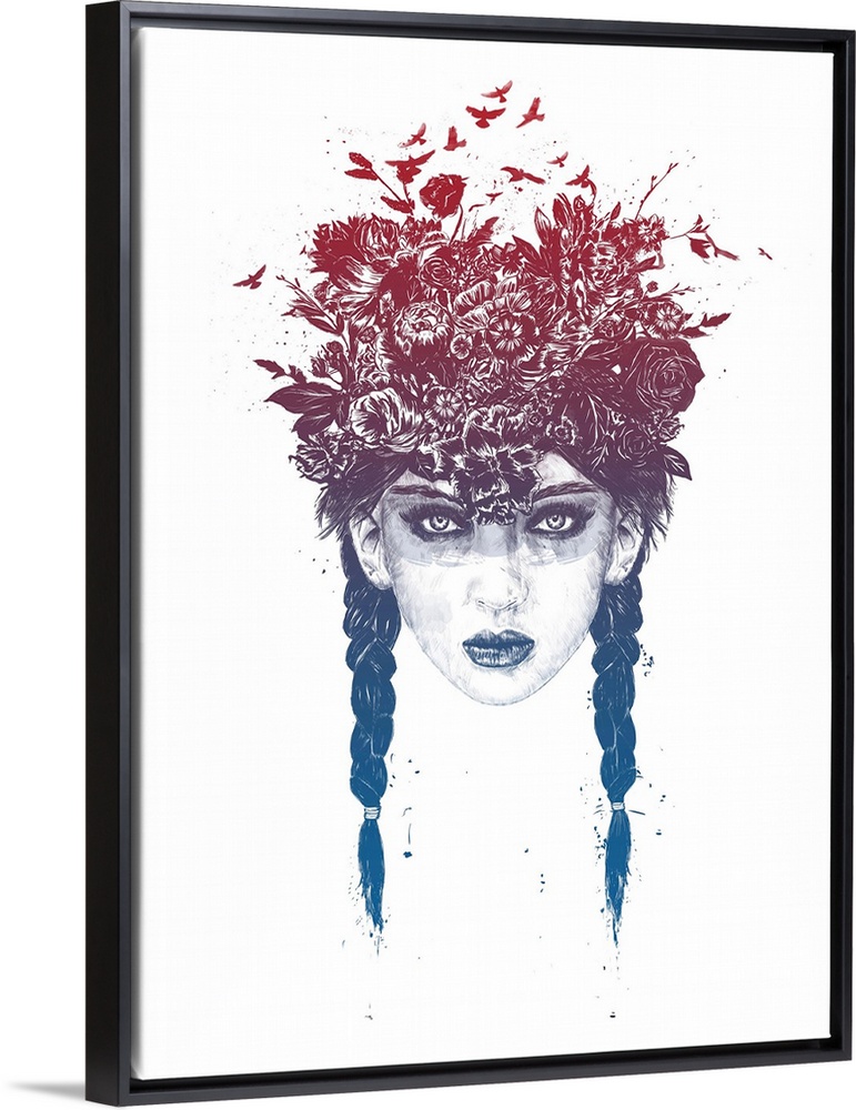 <p>Surrealist portrait of a young woman with flowers and birds coming out the top of her head.</p>