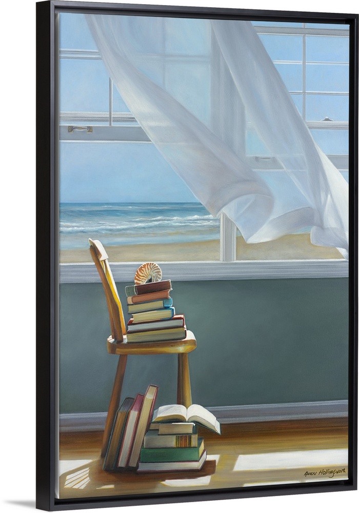 <p>Contemporary still life painting of a stack of books on a chair next to an open window with a white curtain and the beach outside.</p>