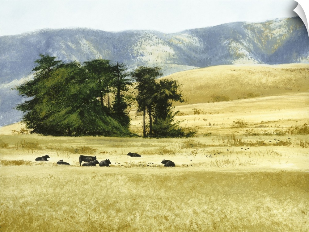 <p>Contemporary painting of cows grazing and laying in a field in the foothills on the countryside.</p>