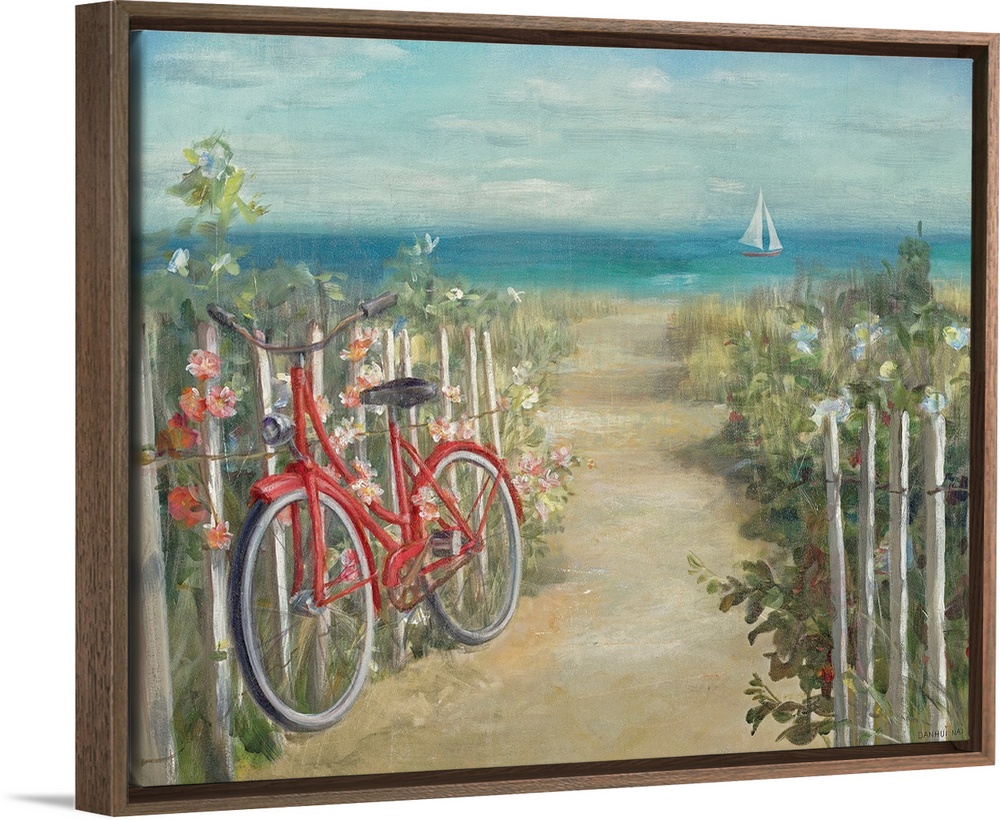 <p>Huge contemporary art depicts a path leading to a beach that is lined with lush vegetation and a bicycle resting against a fence. In the distance a lone sailboat can be seen making its way across the ocean.</p>