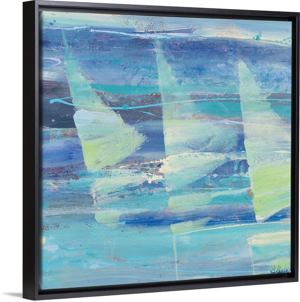 <p>Contemporary painting of three sailboats on the water in varying shades of blue and green.</p>