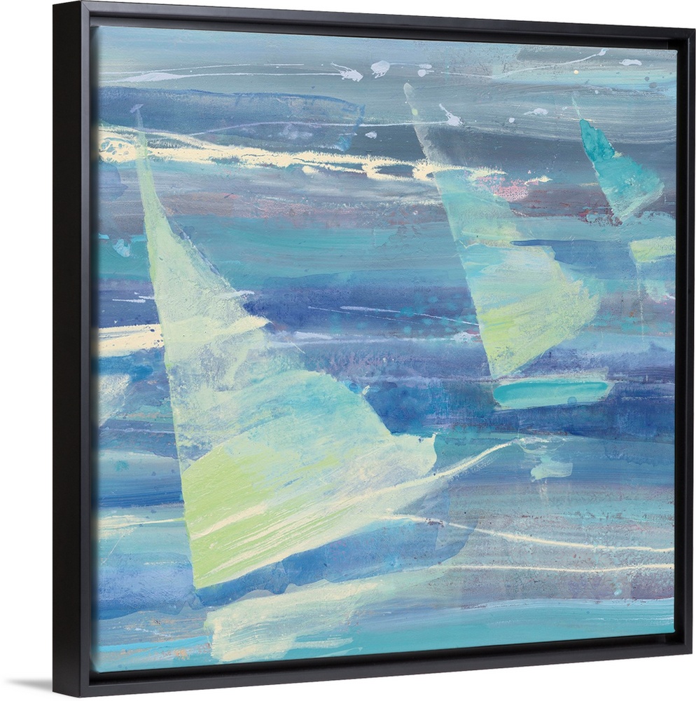 <p>Contemporary painting of three sailboats on the water in varying shades of blue and green.</p>