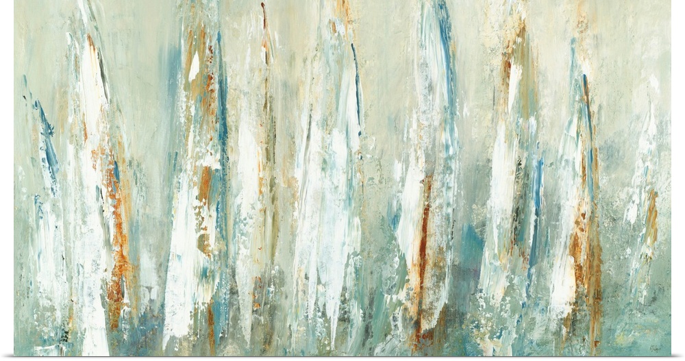 <p>Contemporary painting of abstract sailboat sails in shades of blue, brown, green, white, and yellow.</p>