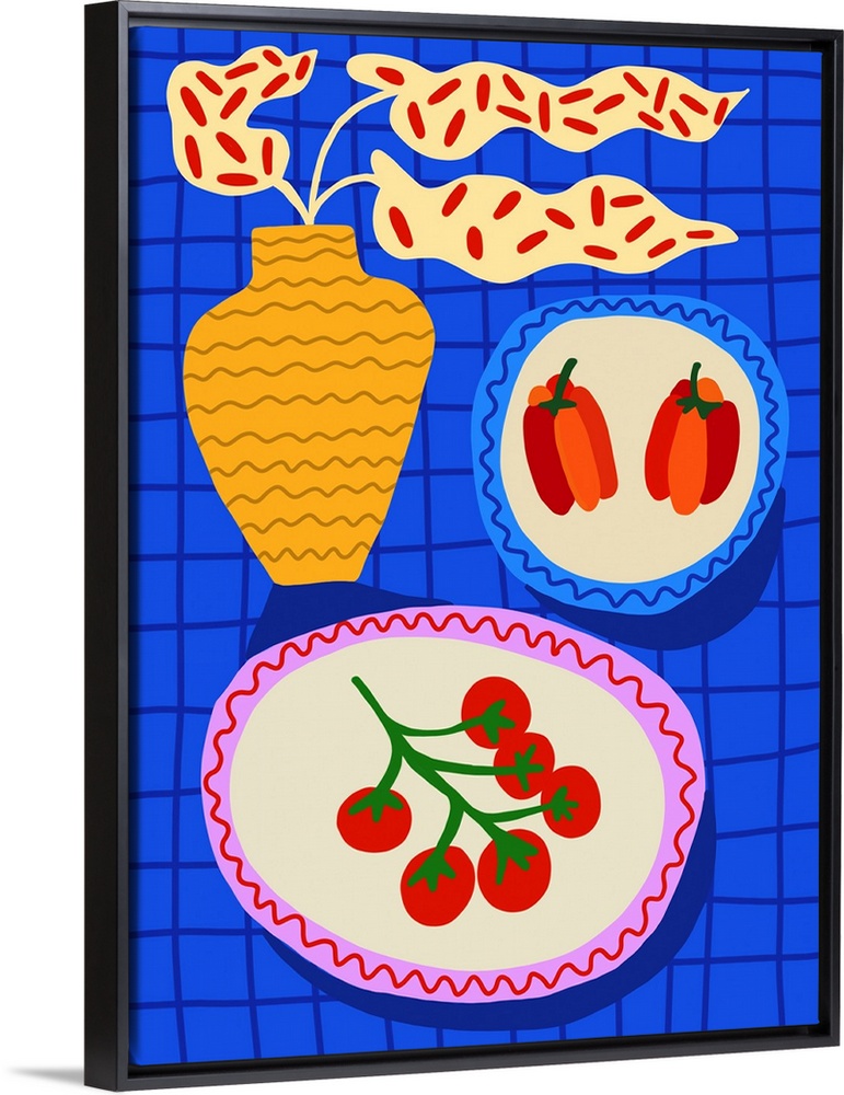 Art Maximalism Blue Wall Art Contemporary Art Florals Food and Drink Food Vegetables Bell Pepper Tomato Graphic Art Teresa Rego Still Life