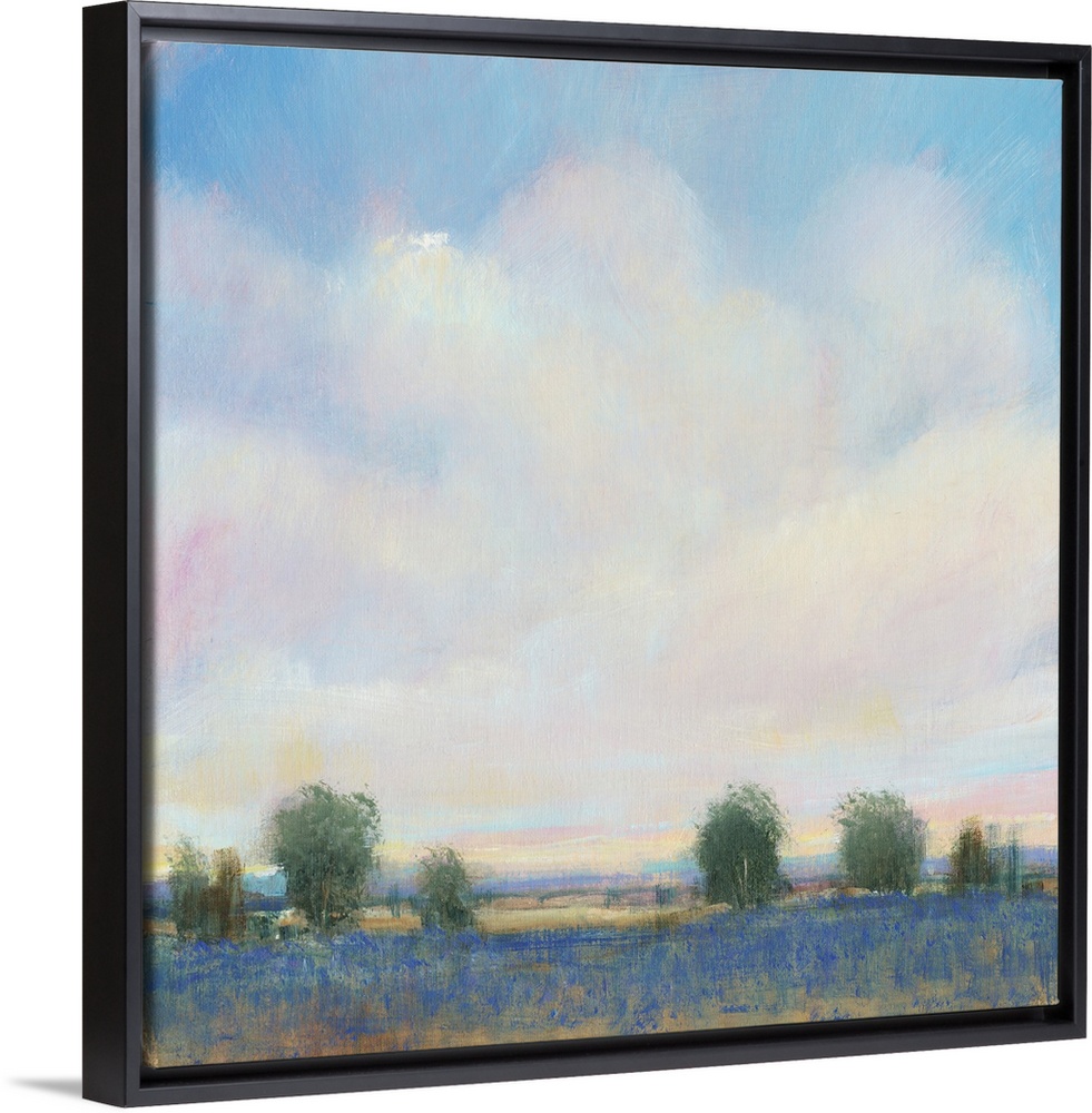 <p>Abstracted landscape painting with a field and trees below a cloudy, blue sky.</p>