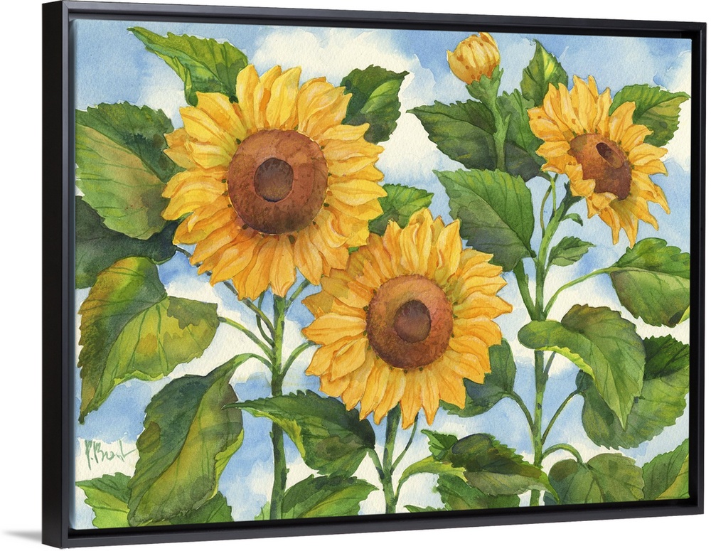 <p>Trio of sunflowers with broad leaves against the sky.</p>