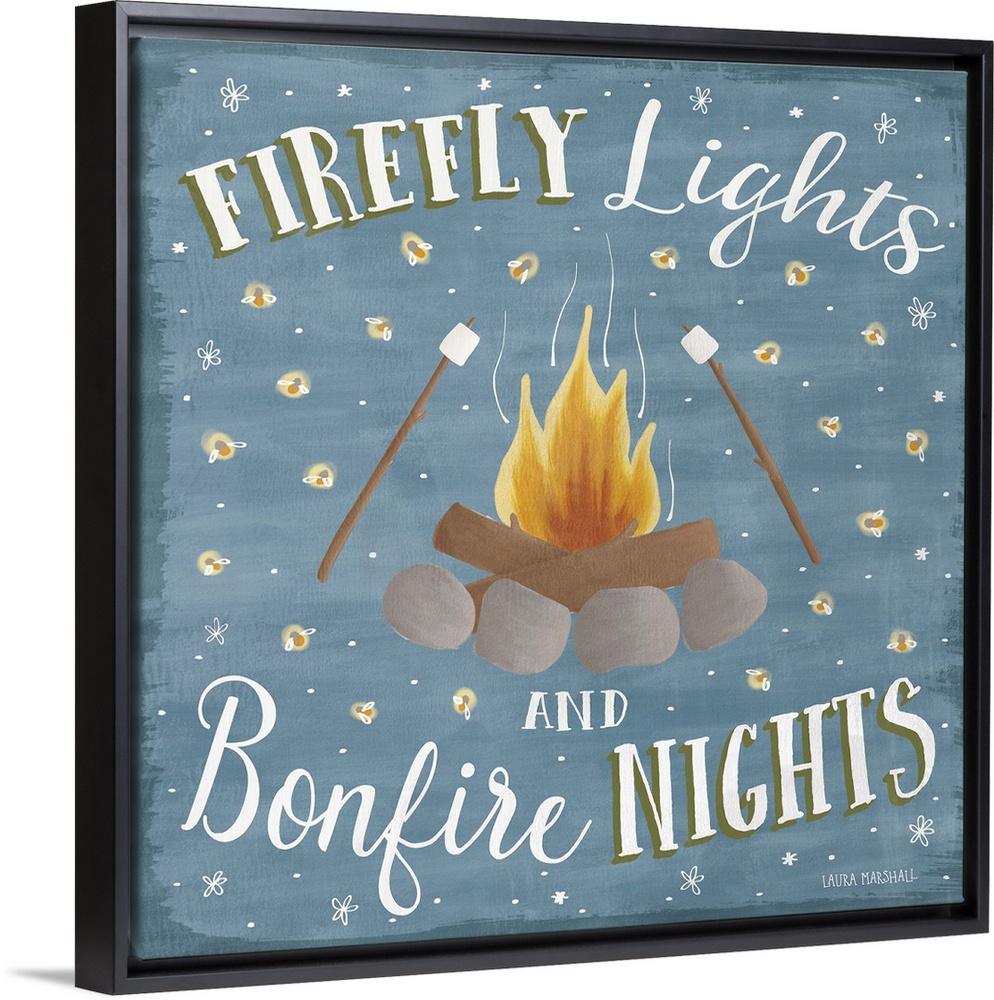 <p>"Firefly Lights and Bonfire Nights" square Summer decor with an illustration of a fire pit with roasting marshmallows and fireflies.</p>