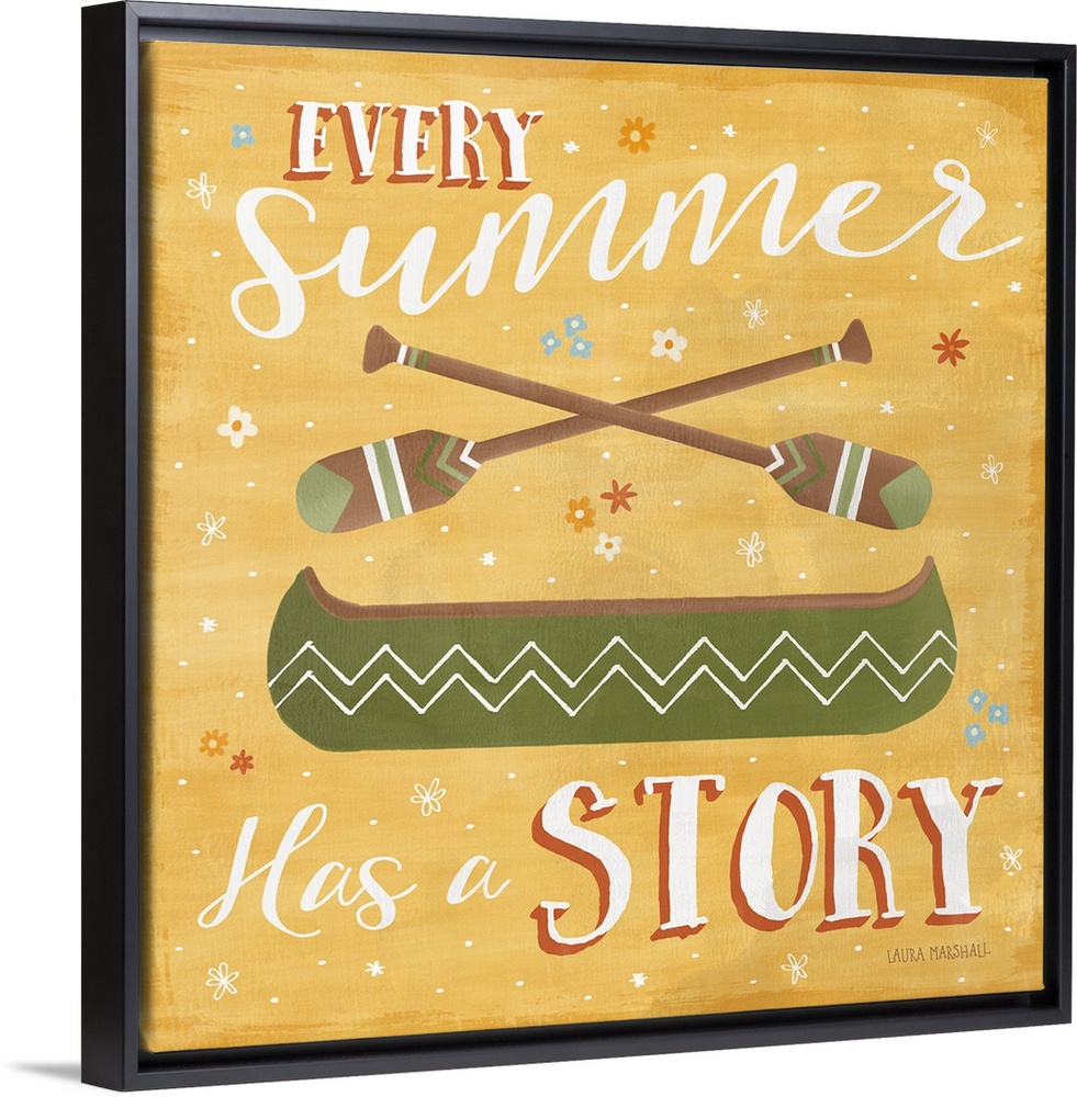 <p>"Every Summer Has a Story" square Summer decor with an illustration of a canoe with paddles and a floral background.</p>