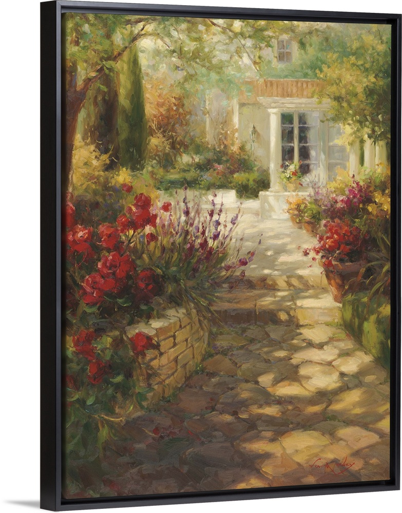 <p>Tranquil painting of a shady cobblestone path leading to a house, lined with flowers.</p>