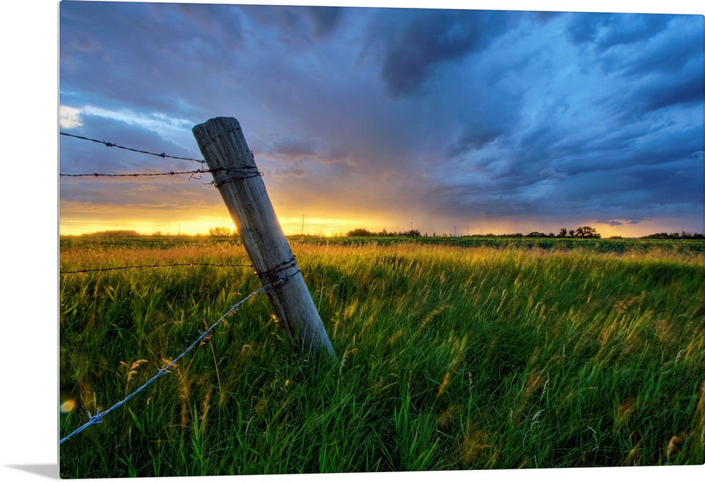 <p>Photograph of wooden fence with barbwire in a field under dark storm clouds.</p>