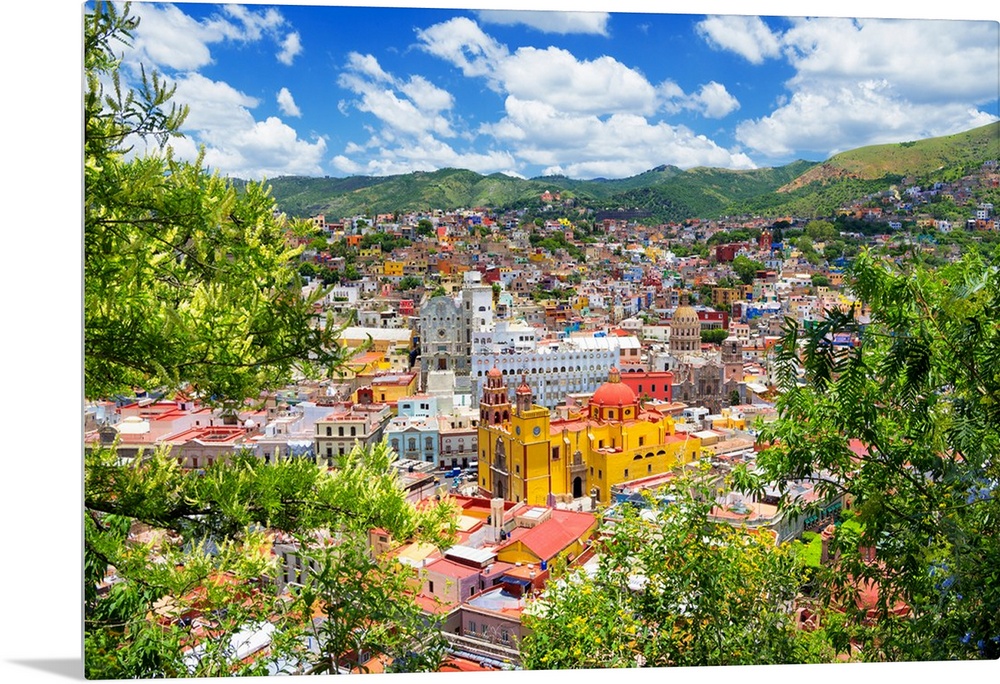 <p>Aerial photograph of a colorful cityscape in Guanajuato, mexico, framed by lush, green trees. From the Viva Mexico Collection.</p>