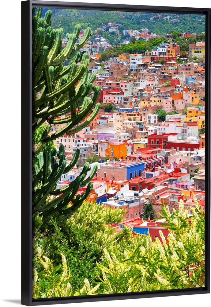 <p>Cityscape photograph of Guanajuato, Mexico, framed with green plants and cacti. From the Viva Mexico Collection.</p>