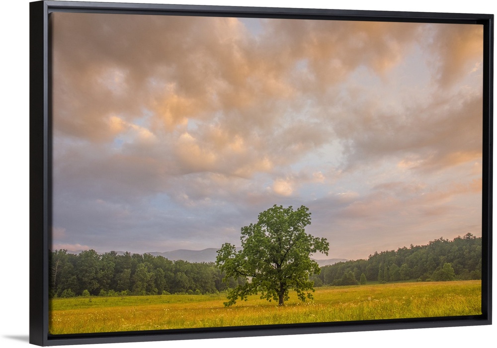 <p>A tree standing in a field under a cloudy sky at sunset in the summer, Great Smoky Mountains, Tennessee.</p>