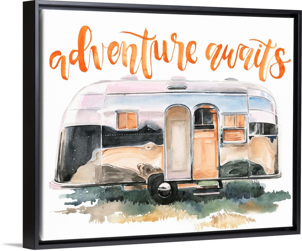 <p>Fun watercolor painting of a caravan with text "Adventure awaits."</p>