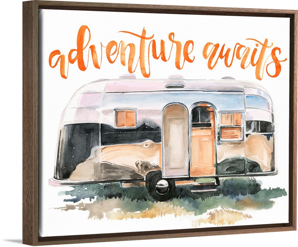 <p>Fun watercolor painting of a caravan with text "Adventure awaits."</p>