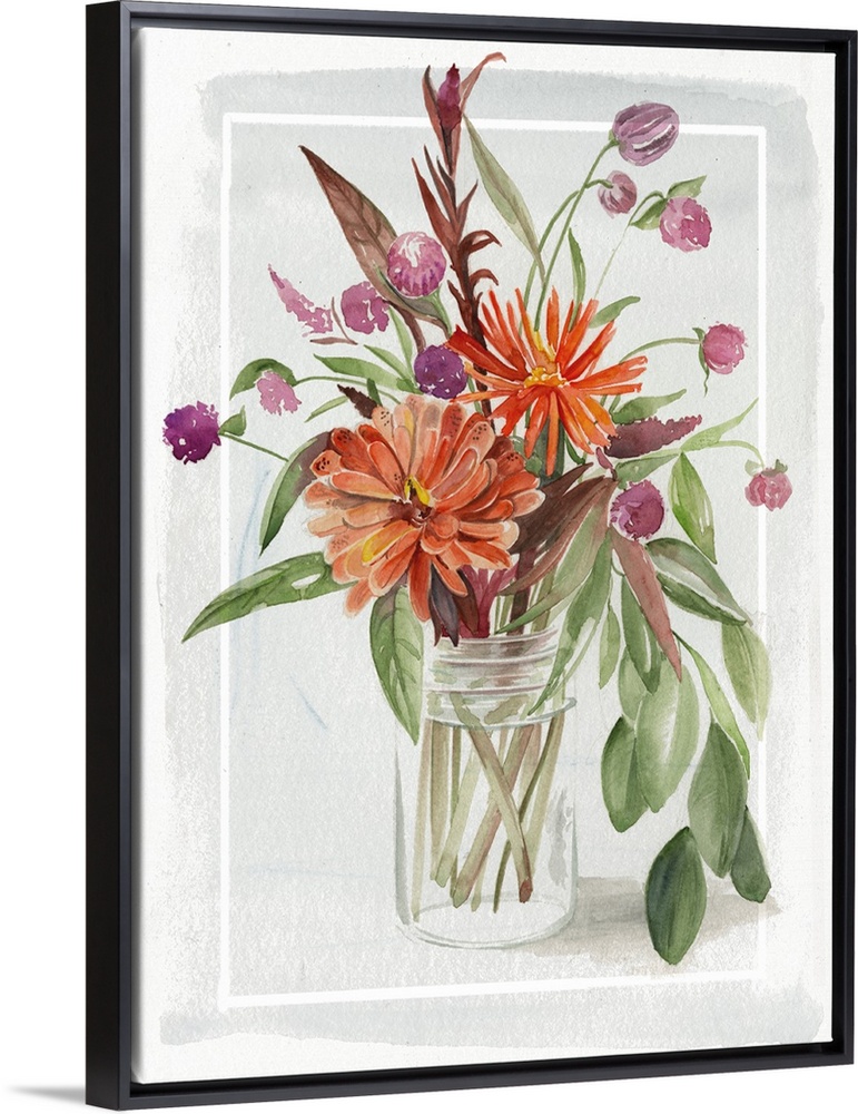 <p>Watercolor painting of a bouquet of summer flowers in a glass jar, with a thin white border.</p>