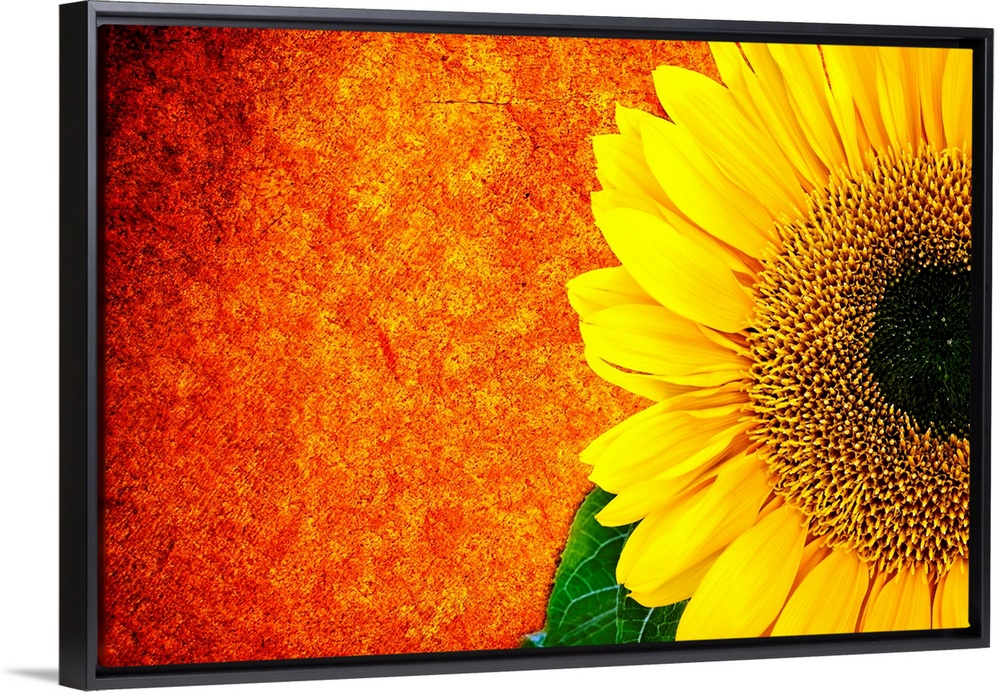 <p>A vibrant, landscape photograph of a golden sunflower on the right, against a fiery orange and red wall in the background at left.</p>