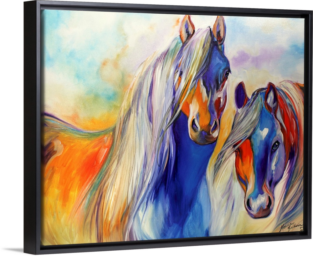 <p>Contemporary painting of two colorful horses standing next to each other with beautifully flowing manes.</p>