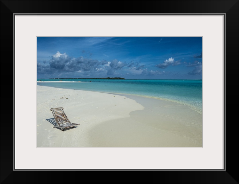 <p>Sun chair on a white sand beach and turquoise water, Sun Island Resort, Nalaguraidhoo island, Ari atoll, Maldives, Indian Ocean</p>