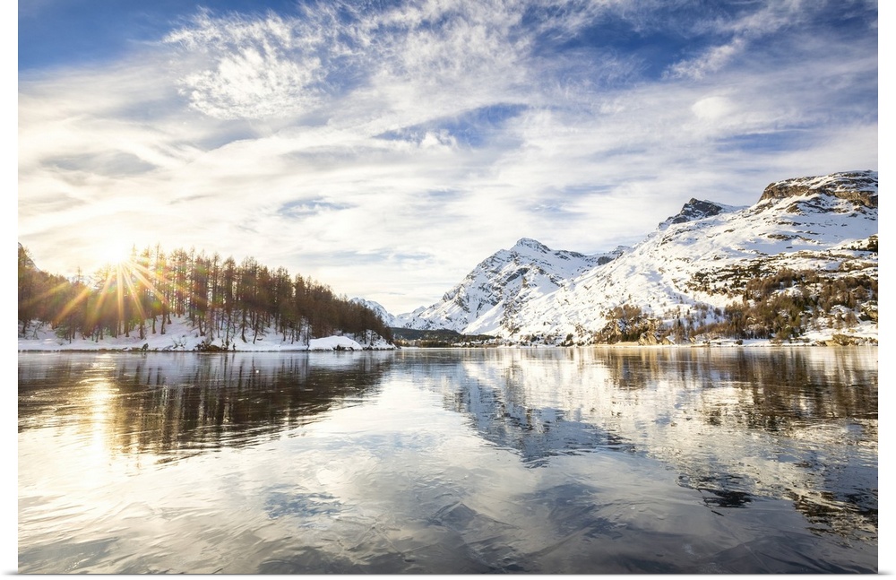 <p>The sun illuminates the icy surfaces of Lake Sils, Engadine Valley, Graubunden, Swiss Alps, Switzerland, Europe</p>