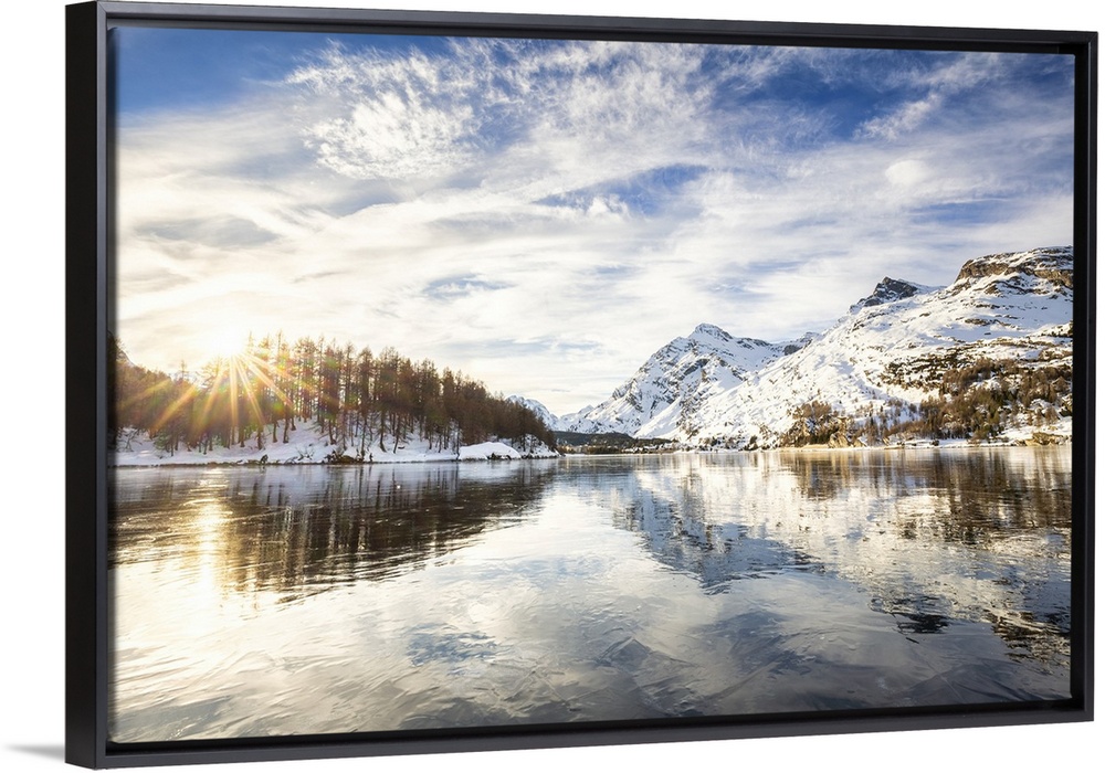 <p>The sun illuminates the icy surfaces of Lake Sils, Engadine Valley, Graubunden, Swiss Alps, Switzerland, Europe</p>