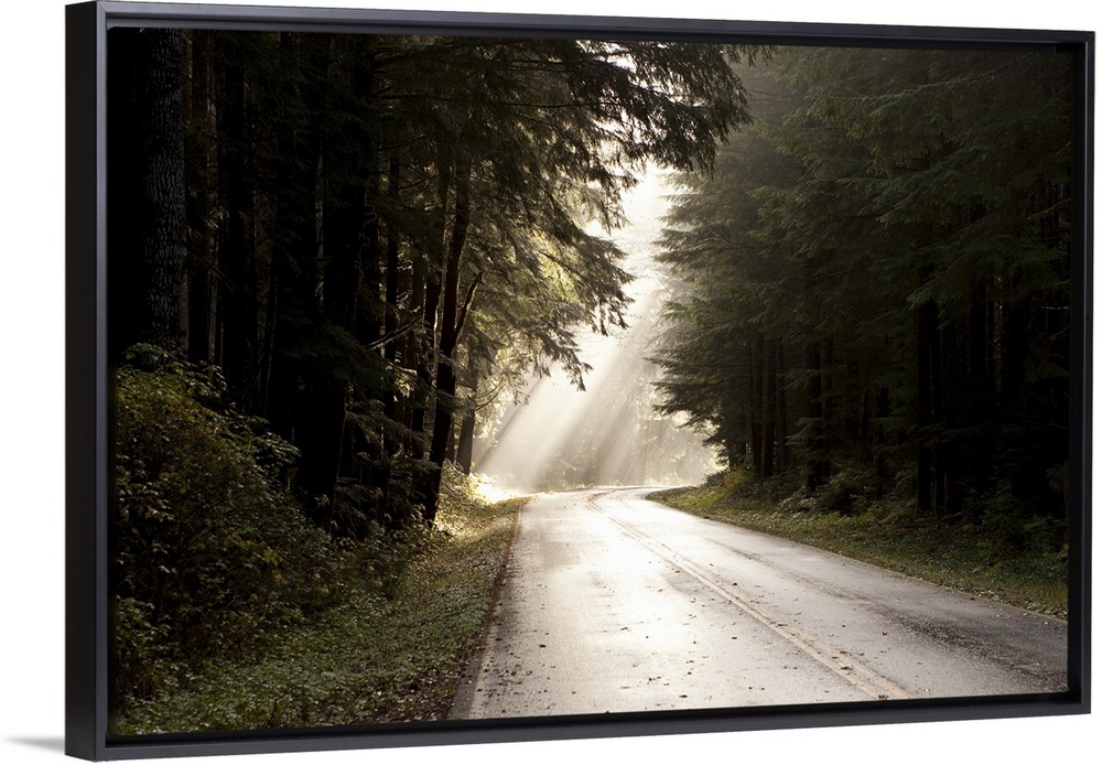 <p>Light shines on a deserted section of road in the Olympic National Park.</p>