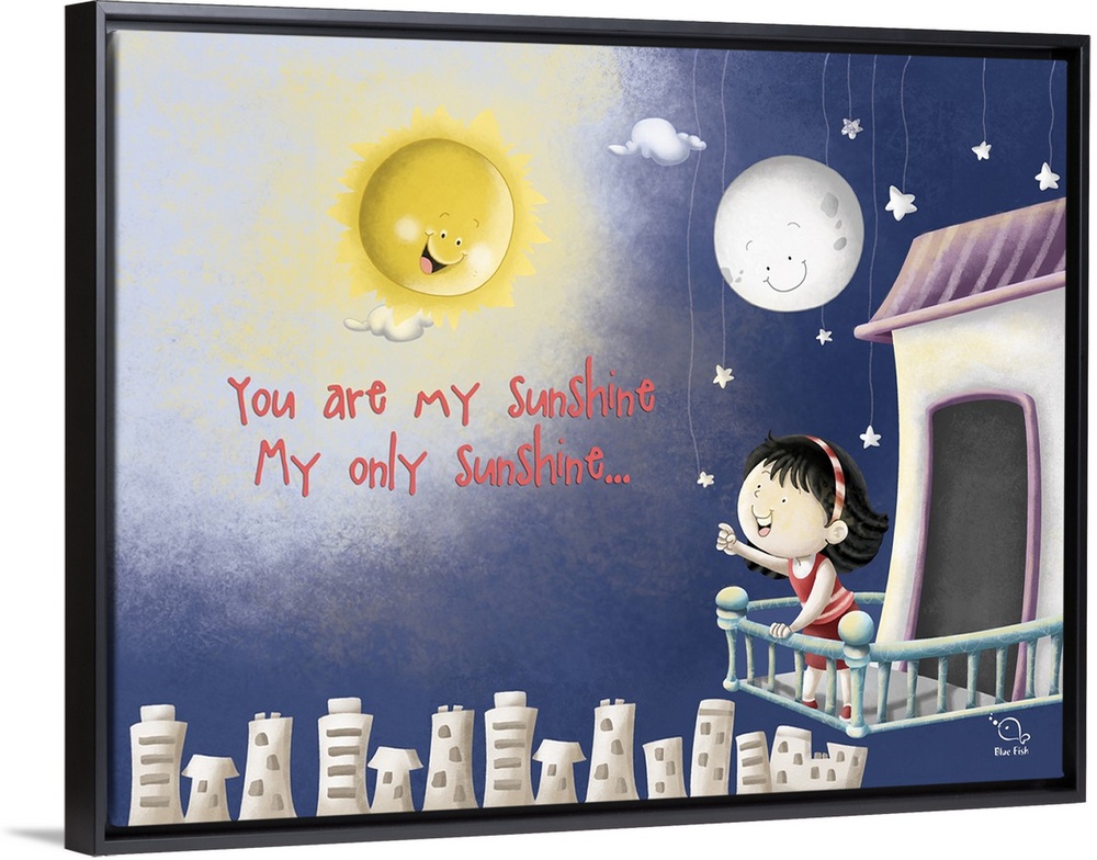 <p>Whimsical illustration of a little girl on a balcony above a city looking at the sun, moon, and stars with "You are my sunshine my only sunshine..." written on the side.</p>