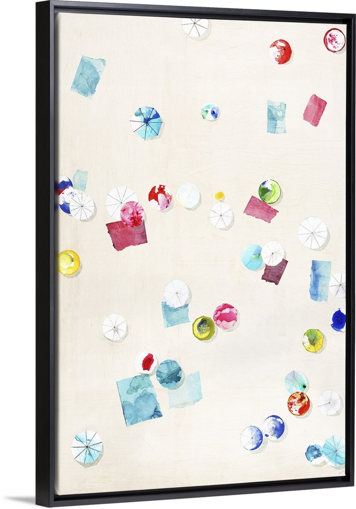 <p>Contemporary painting of an aerial view of a beach filled with colorful umbrellas and towels.</p>