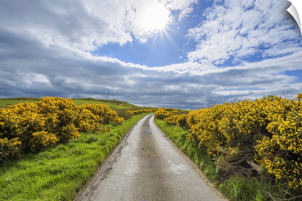 <p>Sun over fields and road through countryside in springtime lined with common gorse in Scotland, United Kingdom</p>