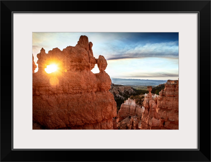 <p>The sun shining through a naturally eroded hole in a hoodoo formation in Bryce Canyon National Park, Utah.</p>