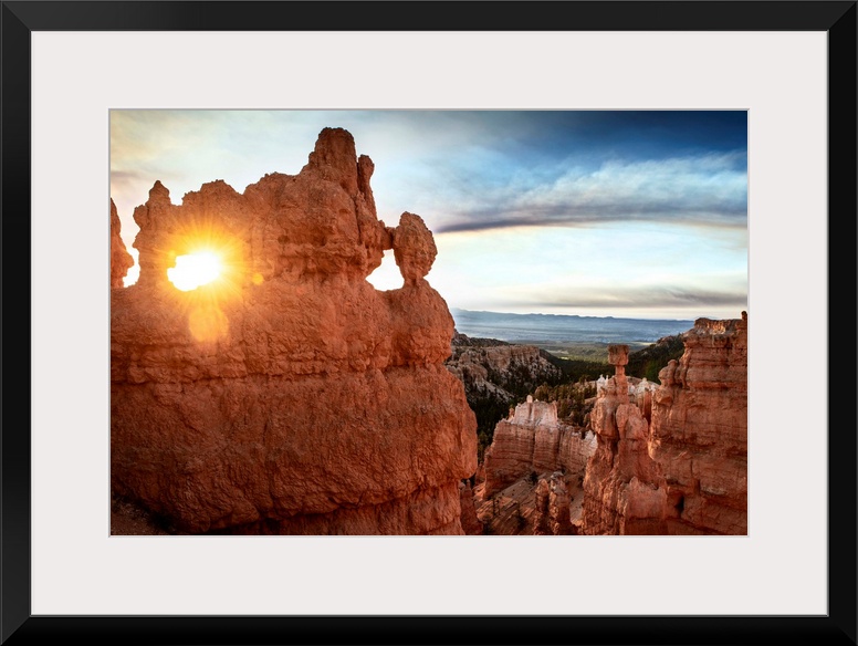 <p>The sun shining through a naturally eroded hole in a hoodoo formation in Bryce Canyon National Park, Utah.</p>