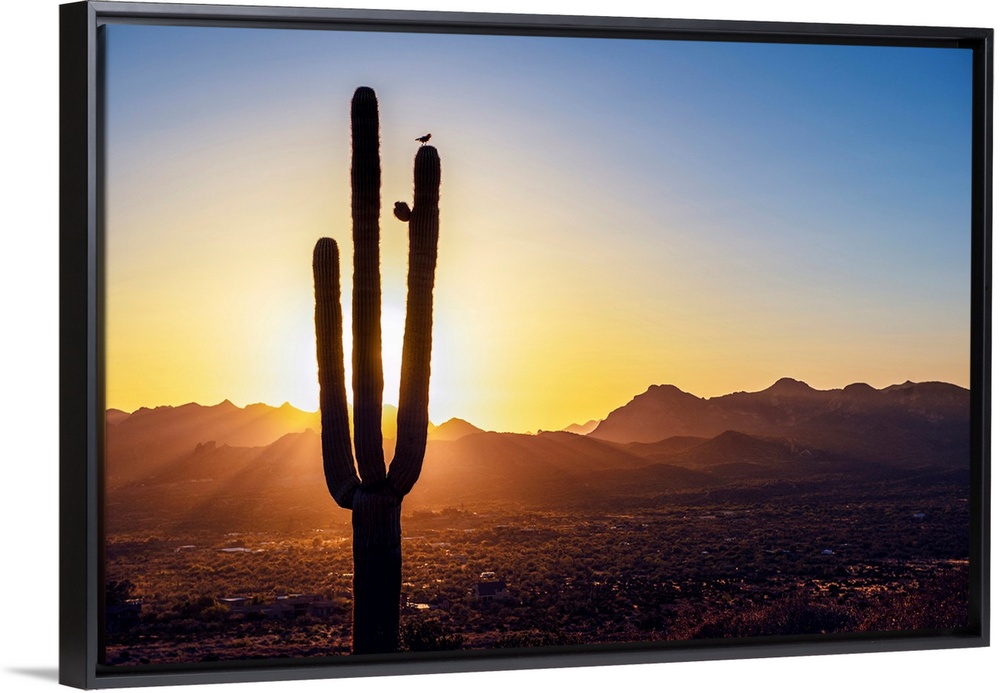 <p>Sun peeking through Saguaro cactus at sunset in Phoenix, Arizona.</p>