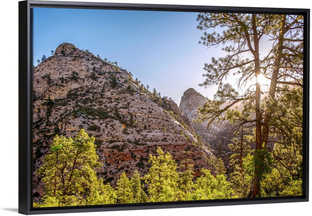 <p>View of mountainside and sun peeking through tree at Zion National Park in Utah.</p>