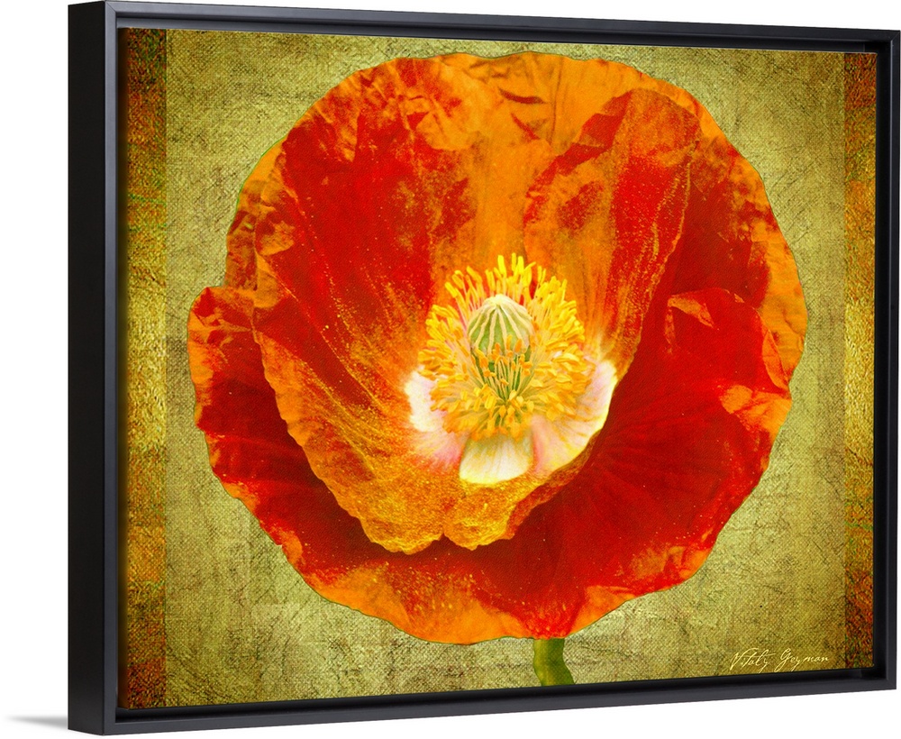 <p>Huge contemporary art focuses on the top of a brightly colored flower against a delicate earth toned background that incorporates a slightly rough texture. Background consists of a single color surrounded by two thin vertical rectangles of darker shades on both sides.</p>
