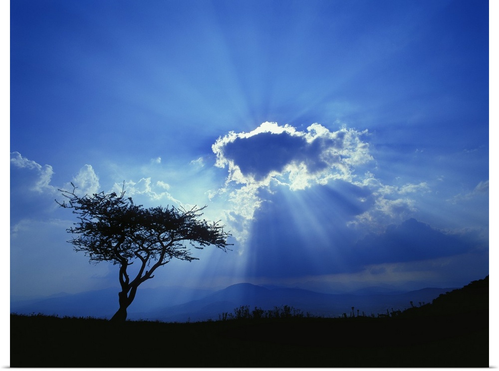 <p>Sun rays burst around a glowing cloud to a silhouetted landscape below, near Mexico City; Mexico</p>