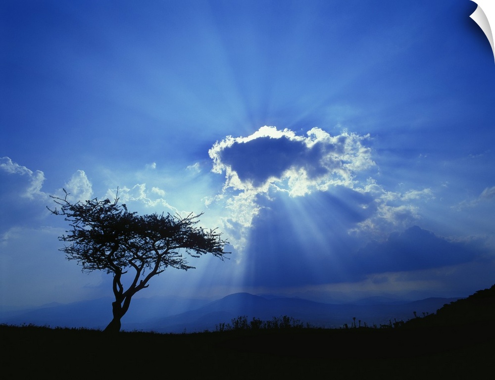 <p>Sun rays burst around a glowing cloud to a silhouetted landscape below, near Mexico City; Mexico</p>