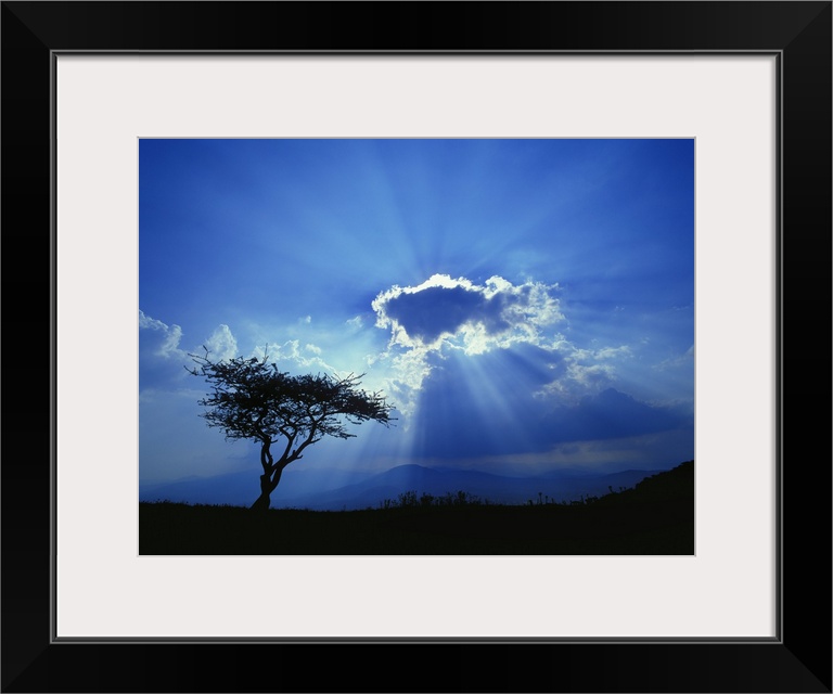 <p>Sun rays burst around a glowing cloud to a silhouetted landscape below, near Mexico City; Mexico</p>