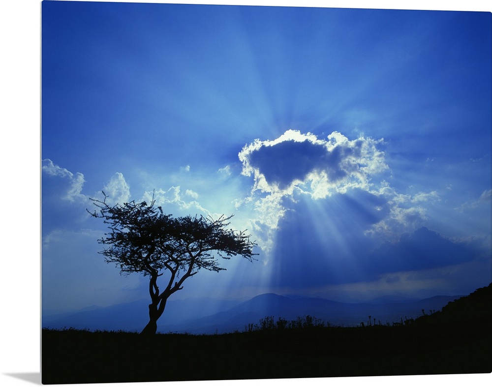 <p>Sun rays burst around a glowing cloud to a silhouetted landscape below, near Mexico City; Mexico</p>