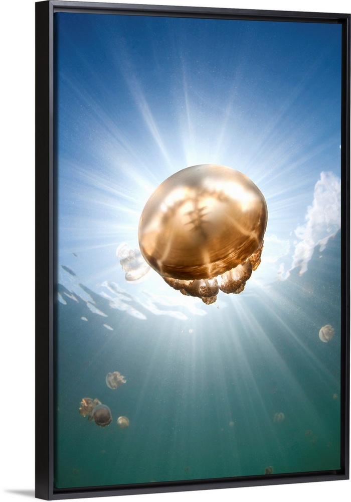 <p>Sunrays illuminate a jellyfish, Mastigias sp., Jellyfish Lake, Kakaban Island, Berau, Kalimantan, Borneo, Indonesia, Pacific Ocean</p>