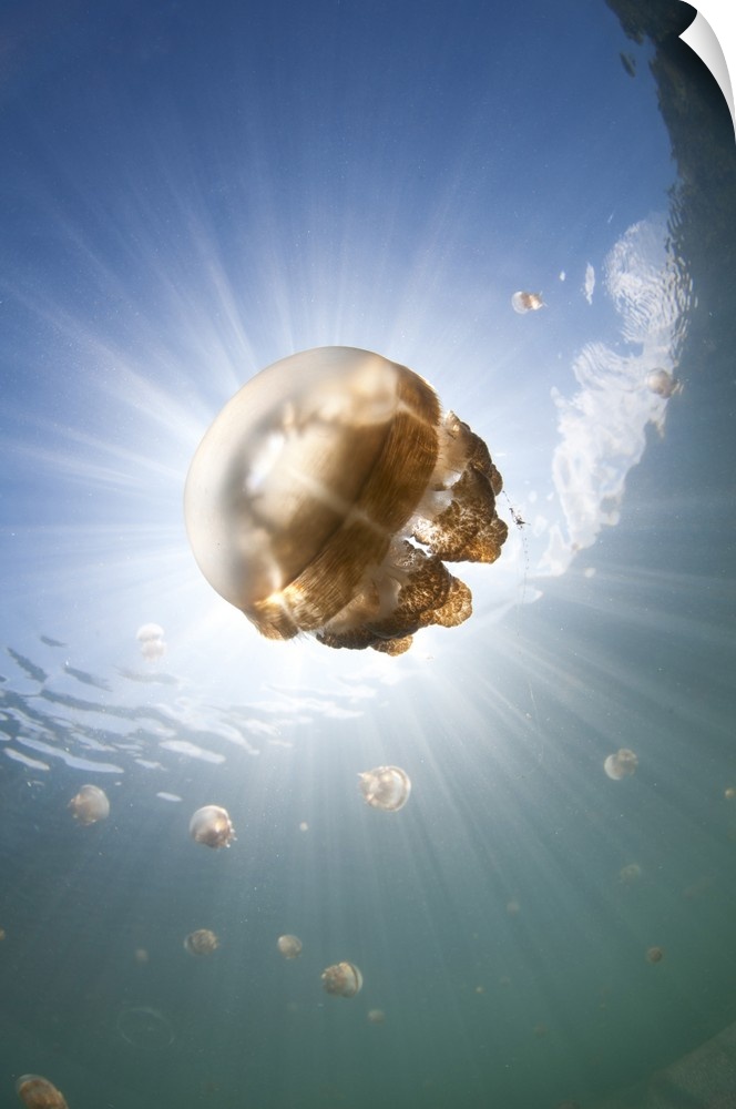<p>Sunrays illuminate a jellyfish, Mastigias sp., Jellyfish Lake, Kakaban Island, Berau, Kalimantan, Borneo, Indonesia, Pacific Ocean</p>