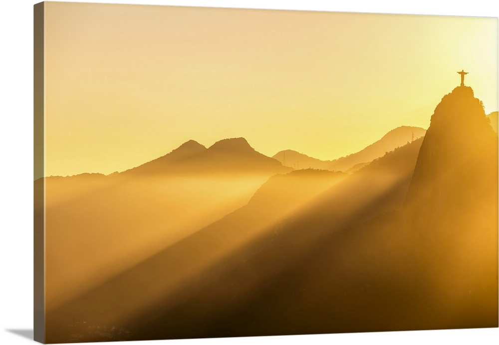 <p>Sun rays over hills and Christ the Redeemer statue of Rio De Janeiro; Rio de Janeiro, Rio de Janeiro, Brazil.</p>