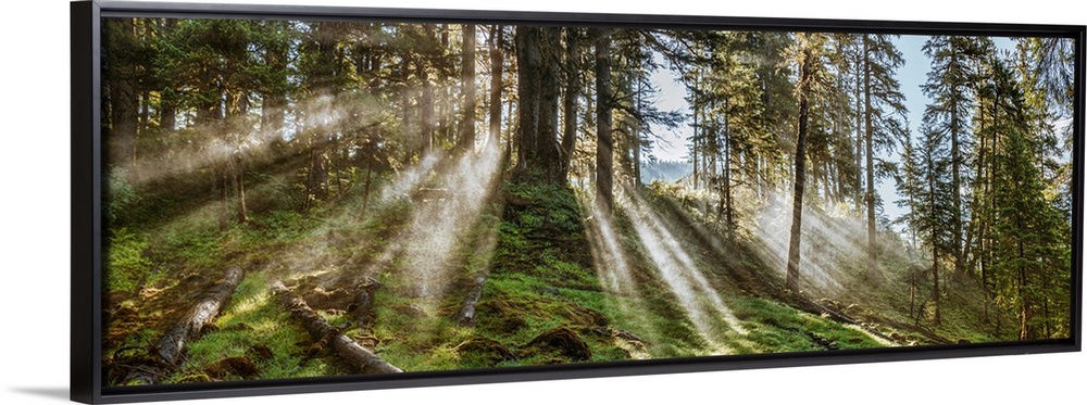 <p>Sun rays passing through trees in forest, Southeast Alaska, Alaska, USA.</p>