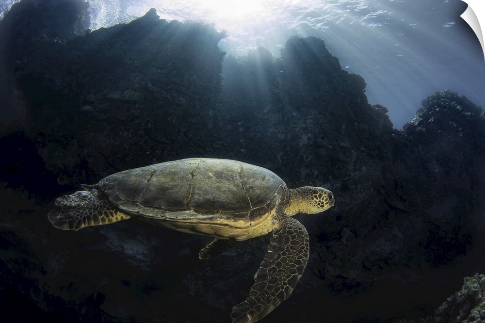 <p>Sun rays shine over a lava ridge onto a green sea turtle, Chelonia mydas, an endangered species, Maui, Hawaii.</p>